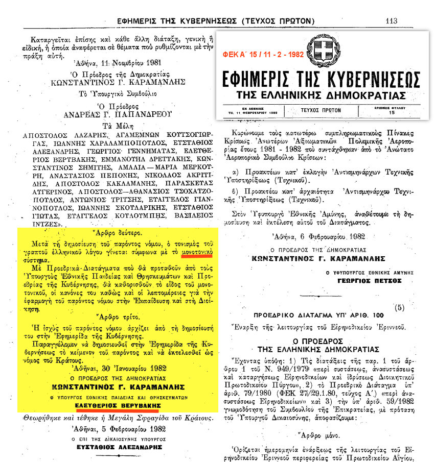 Επί ΠΑΣΟΚ πάλι, ο Υπουργός Παιδείας Ελευθέριος Βερυβάκης, επί Κυβερνήσεως Ανδρέα Παπανδρέου, με αιφνιδιαστική (ν)τροπολογία μέσα στην νύχτα, πέρασε την κατάργηση του λεγόμενου “πολυτονικού”, των χαριτωμένων πνευμάτων και τόνων (ψιλή – δασεία, περισπωμένη) και επέβαλε την καθιέρωση του “μονοτονικού”! Η άθλια εκείνη διάταξη, ψηφίστηκε μετά τα μεσάνυχτα της 11ης Φεβρουαρίου 1982, από τριάντα μόνον παρόντες Βουλευτές… (κατεβάστε εδώ το ΦΕΚ). Το προσυπέγραψε δε και πάλι, αυτή τη φορά ως Πρόεδρος Δημοκρατίας, ο Κωνσταντίνος Καραμανλής…
