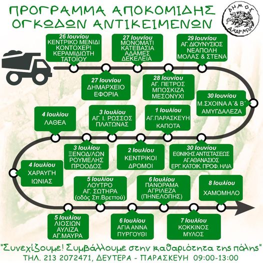Συνεχίζεται για μια ακόμη εβδομάδα από τη Διεύθυνση Καθαριότητας & Ανακύκλωσης του Δήμου Αχαρνών το Πρόγραμμα Αποκομιδής Ογκωδών Αντικειμένων σε όλες τις γειτονιές της πόλης. Το νέο πρόγραμμα από τις 26 Ιουνίου έως τις 7 Ιουλίου δημοσιοποιείται ώστε οι δημότες να είναι σε θέση να προγραμματίσουν τις εργασίες τους, για να μη μένουν μεγάλου μεγέθους αντικείμενα εκτεθειμένα για μέρες.