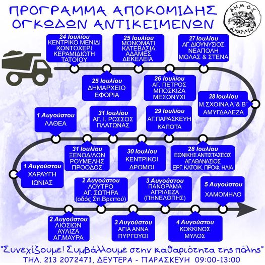 Συνεχίζεται απρόσκοπτα από τη Διεύθυνση Καθαριότητας & Ανακύκλωσης του Δήμου Αχαρνών το Πρόγραμμα Αποκομιδής Ογκωδών Αντικειμένων σε όλες τις γειτονιές της πόλης. Το νέο πρόγραμμα θα ισχύει από τις 24 Ιουλίου έως τις 5 Αυγούστου και δημοσιοποιείται ώστε οι δημότες να είναι σε θέση να προγραμματίσουν τις εργασίες τους, για να μη μένουν μεγάλου μεγέθους αντικείμενα εκτεθειμένα για μέρες.