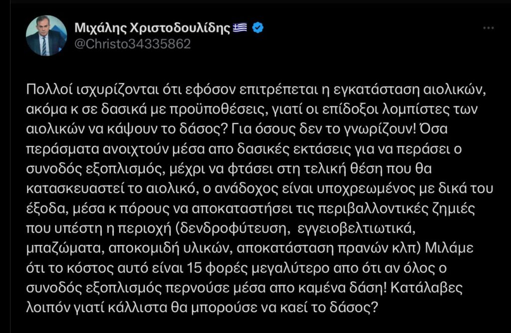 – Οἱ ἐγκαταστάσεις τῶν ἀνεμογεννητριῶν ἐξυπηρετοῦν τὰ εὐκαιριακὰ συμφέροντα τῶν ἐπιχειρηματιῶν τῆς αἰολικῆς ἐνέργειας, ποὺ σπεύδουν νὰ ἀξιοποιήσουν τὰ Εὐρωπαϊκὰ κονδύλια.