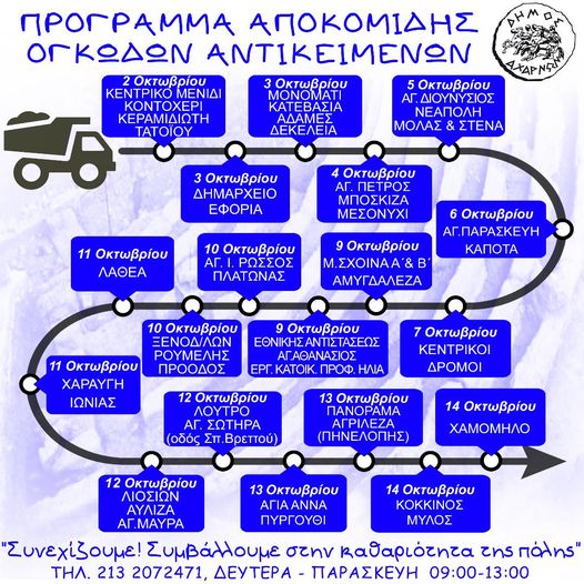 O Δήμος Αχαρνών στο πλαίσιο της καλλίτερης ενημέρωσης των Δημοτών δημοσιοποιεί το νέο πρόγραμμα αποκομιδής ογκωδών αντικειμένων από τις 2-14 Οκτωβρίου. Επτά ημέρες την εβδομάδα τα συνεργεία του Δήμου μας δίνουν τον δικό τους αγώνα με γνώμονα την εξασφάλιση ενός βιώσιμου και υγιούς περιβάλλοντος. Το πρόγραμμα δημοσιοποιείται ώστε οι δημότες να είναι σε θέση να προγραμματίσουν τις εργασίες τους, για να μη μένουν μεγάλου μεγέθους αντικείμενα εκτεθειμένα για μέρες.