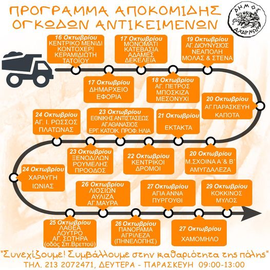 Ο Δήμος Αχαρνών στο πλαίσιο της καλλίτερης ενημέρωσης των Δημοτών δημοσιοποιεί το νέο πρόγραμμα αποκομιδής ογκωδών αντικειμένων από τις 16-29 Οκτωβρίου.