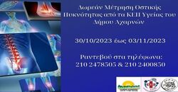 Τα Κεπ Υγείας Δήμου Αχαρνών σε συνεργασία με το Ελληνικό Διαδημοτικό Δίκτυο Υγιών Πόλεων διοργανώνουν εβδομάδα ελέγχου οστικής πυκνότητας για γυναίκες και άντρες στον Δήμο Αχαρνών. Ο έλεγχος θα πραγματοποιείται με υπέρηχο πτέρνας στην Αίθουσα Εκδηλώσεων «Μάριος Δημήτριος Σουλούκος» στο κτίριο του Δημαρχείου Αχαρνών, στην οδό Φιλαδελφείας 87 το διάστημα από τις 30/10/2023 έως τις 03/11/2023 και ώρες από τις 09:00-16:00.
