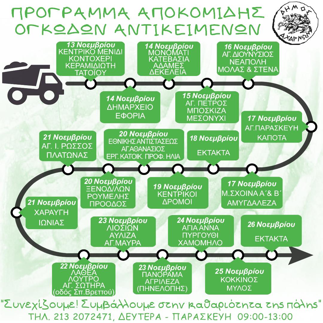 Ο Δήμος Αχαρνών στο πλαίσιο της καλύτερης ενημέρωσης των Δημοτών δημοσιοποιεί το νέο πρόγραμμα αποκομιδής ογκωδών αντικειμένων για το διάστημα από τις 13-26 Νοεμβρίου. Συγκεκριμένα, επτά ημέρες την εβδομάδα τα συνεργεία του Δήμου δίνουν τον δικό τους αγώνα με γνώμονα την εξασφάλιση ενός βιώσιμου και υγιούς περιβάλλοντος.