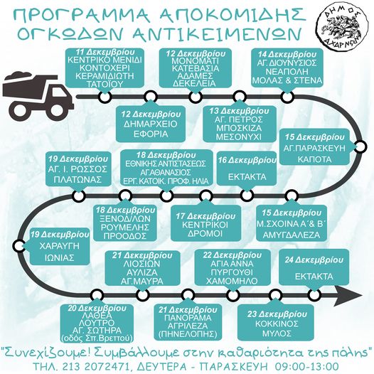 Ο Δήμος Αχαρνών στο πλαίσιο της καλλίτερης ενημέρωσης των Δημοτών δημοσιοποιεί το νέο πρόγραμμα αποκομιδής ογκωδών αντικειμένων από τις 11 έως τις 24 Δεκεμβρίου.