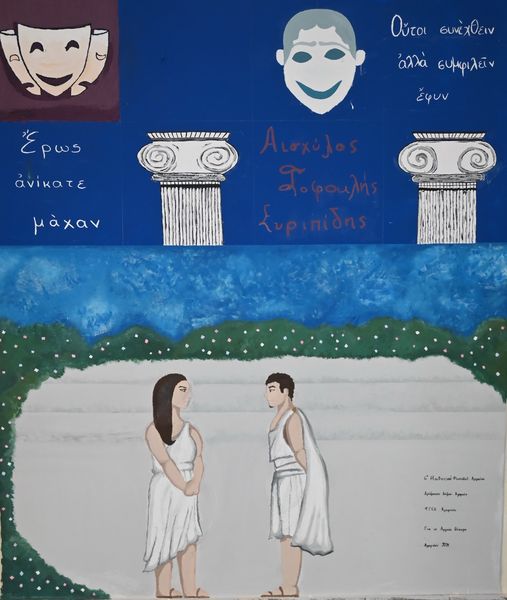 Στο πλαίσιο του 6ου Μαθητικού Φεστιβάλ Αρχαίου Δράματος – Αχαρνές 2024 που διοργανώνει ο Δήμος Αχαρνών (Τμήμα Αρχαιολογίας και Ιστορικής Έρευνας και Τμήμα Πολιτισμού, Προγραμμάτων και Δράσεων) για την προβολή του αρχαίου θεάτρου των Αχαρνών οι μαθητές του 4ου ΓΕΛ Αχαρνών ανταποκρινόμενοι στη πρόσκληση του Τμήματος Αρχαιολογίας και Ιστορικής Έρευνας για συμμετοχή στη φετινή εικαστική δραστηριότητα γκράφιτι με τίτλο: «Ζωγραφίζω τους τοίχους του σχολείου μου με θέματα εμπνευσμένα από το αρχαίο θέατρο» φιλοτέχνησαν σε εσωτερικούς τοίχους του Σχολείου τους, δυο τοιχογραφίες.