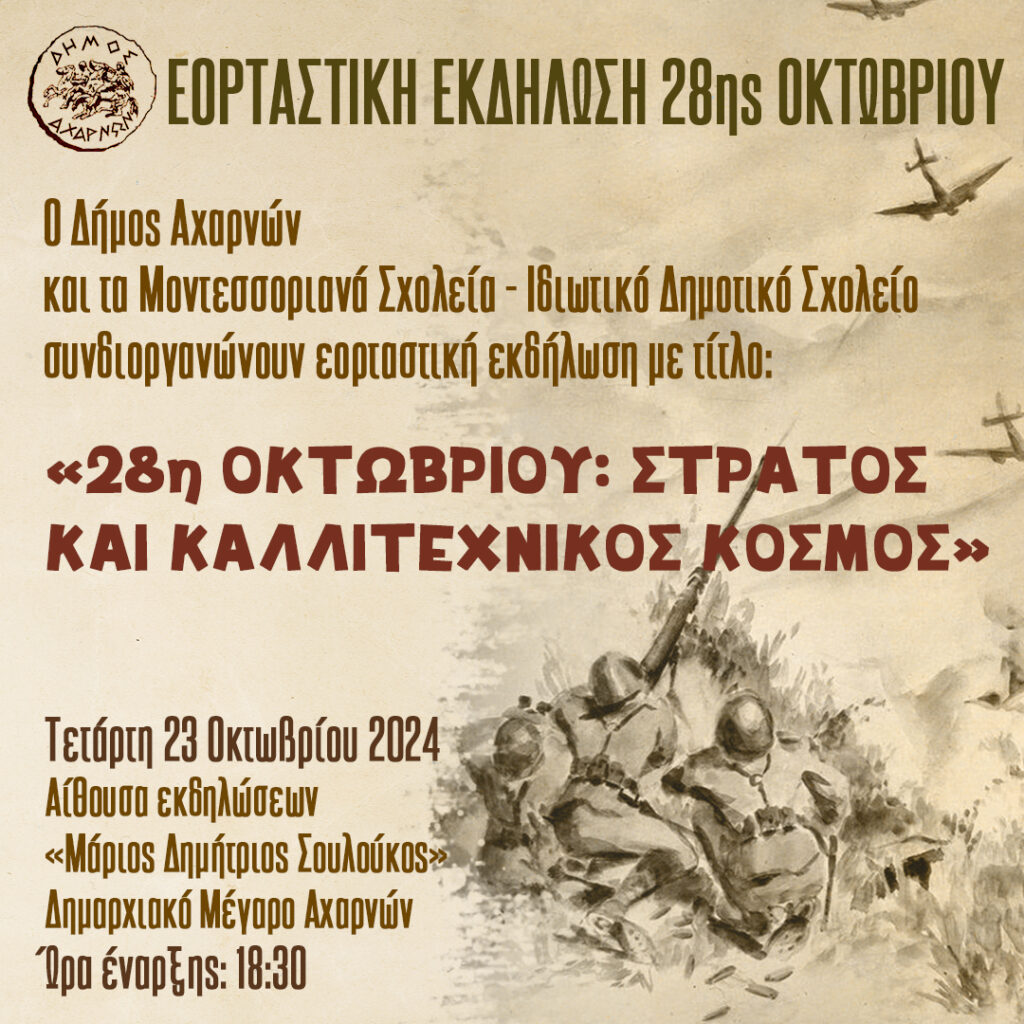 Ο Δήμος Αχαρνών και τα Μοντεσσοριανά Σχολεία- Ιδιωτικό Δημοτικό Σχολείο συνδιοργανώνουν εορταστική εκδήλωση με τίτλο: «28η Οκτωβρίου: Στρατός και Καλλιτεχνικός Κόσμος». Τετάρτη 23 Οκτωβρίου- Αίθουσα Εκδηλώσεων «Μάριος Δημήτριος Σουλούκος»