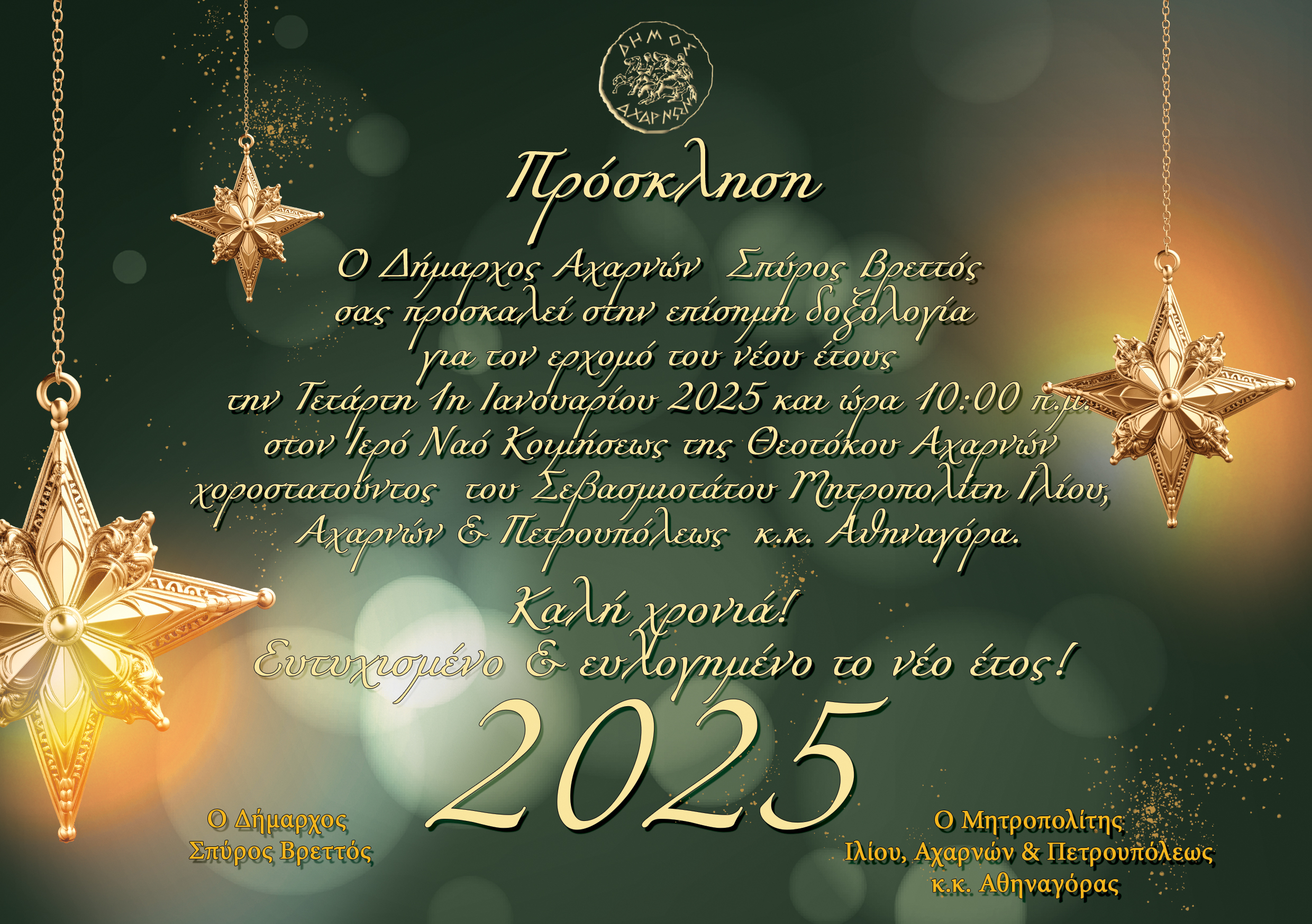 Ο Δήμαρχος Αχαρνών Σπύρος Βρεττός σας προσκαλεί στην επίσημη δοξολογία για τον ερχομό του νέου έτους την Τετάρτη 1η Ιανουαρίου, στις 10, στον Ιερό Ναό Κοιμήσεως της Θεοτόκου χοροστατούντος του Σεβασμιωτάτου Μητροπολίτου Ιλίου, Αχαρνών και Πετρουπόλεως κ. Αθηναγόρα.