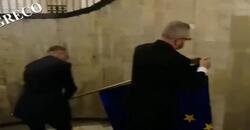 Στο υπουργείο Βιομηχανίας στην πόλη Κατοβίτσε της Πολωνίας, ο υποψήφιος για την προεδρία Γκρέγκορζ Μπράουν πραγματοποίησε μια ακόμη «κοινοβουλευτική παρέμβαση», κατά την οποία κατέβασε τη σημαία της ΕΕ και σκούπισε πάνω της τα παπούτσια του.