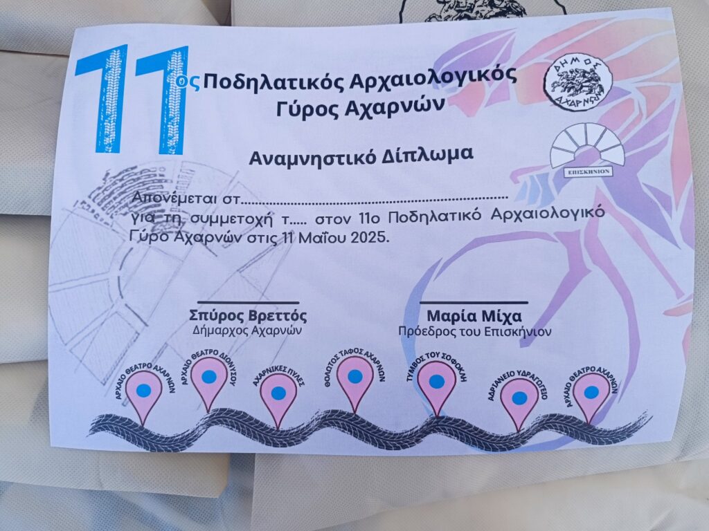 Με εξαιρετική επιτυχία και με τη συμμετοχή άνω των 250 ποδηλατών πραγματοποιήθηκε ο 11ος Ποδηλατικός Αρχαιολογικός Γύρος Αχαρνών, που διοργανώθηκε από το Δήμο Αχαρνών μέσω της Διεύθυνσης Πολιτισμού, Αθλητισμού και το ΕΠΙΣΚΗΝΙΟΝ σε συνεργασία με την Εφορεία Αρχαιοτήτων Δυτικής Αττικής με σκοπό την προβολή του Αρχαίου Θεάτρου Αχαρνών.