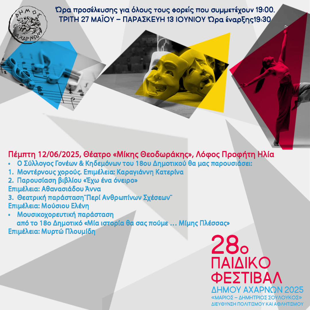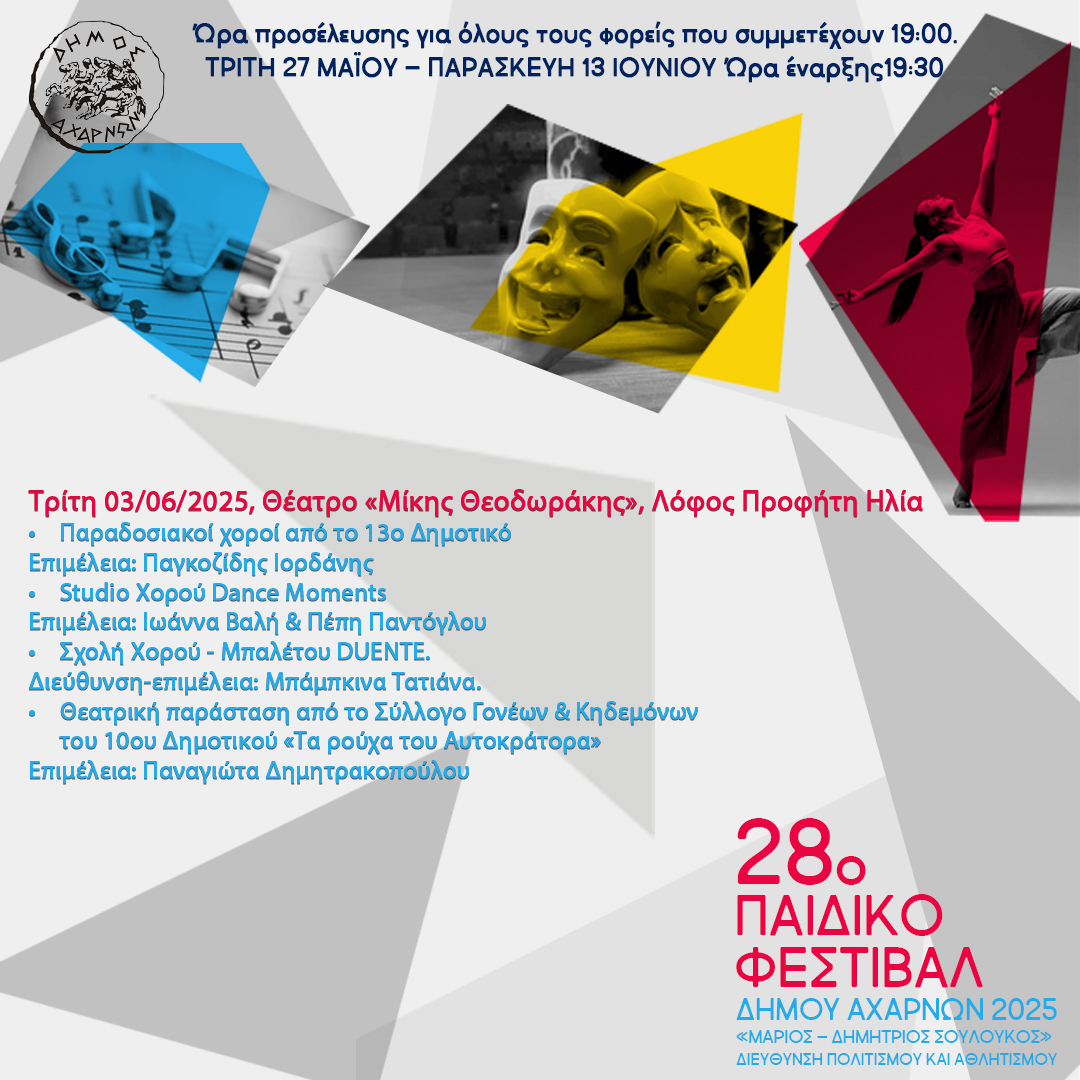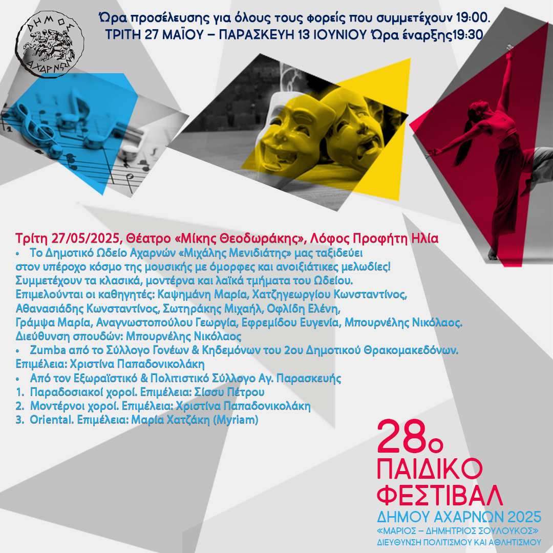 Ο Δήμος Αχαρνών προσκαλεί μικρούς και μεγάλους να απολαύσουν τις παραστάσεις των παιδιών και να στηρίξουν την καλλιτεχνική τους προσπάθεια. Ελάτε να γιορτάσουμε μαζί τον πολιτισμό, τη δημιουργία και τη χαρά της παιδικής έκφρασης!
