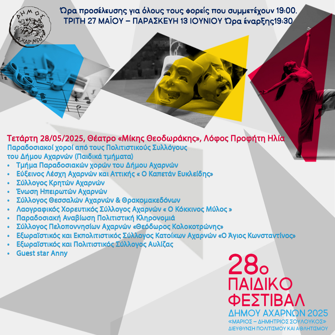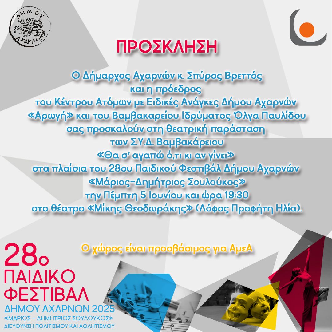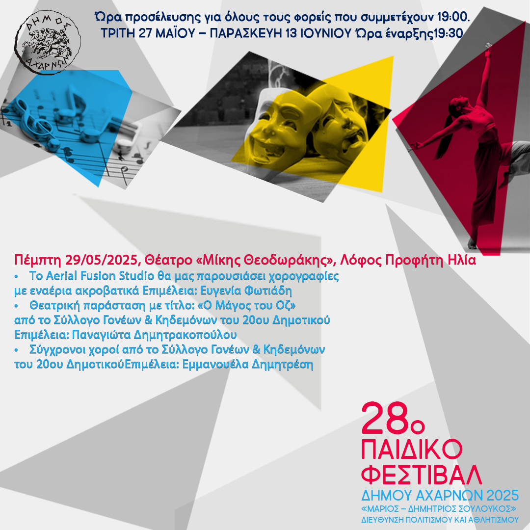 Ο Δήμος Αχαρνών προσκαλεί μικρούς και μεγάλους να απολαύσουν τις παραστάσεις των παιδιών και να στηρίξουν την καλλιτεχνική τους προσπάθεια. Ελάτε να γιορτάσουμε μαζί τον πολιτισμό, τη δημιουργία και τη χαρά της παιδικής έκφρασης!