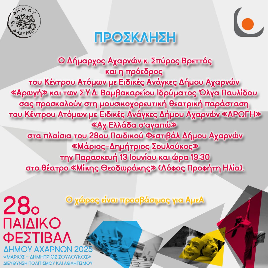 - Μουσικοχορευτική παράσταση «Αχ Ελλάδα σ΄αγαπώ» από το ΚΔΑΠ ΑΜΕΑ «ΑΡΩΓΗ» Επιμέλεια: Κυριακοπούλου Ευαγγελία