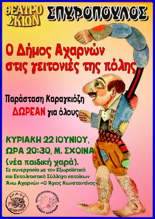 Την Κυριακή 22 Ιουνίου, στη νέα παιδική χαρά (Μεγάλα Σχοίνα), θα πραγματοποιηθεί παράσταση Καραγκιόζη, με ελεύθερη είσοδο για όλους.