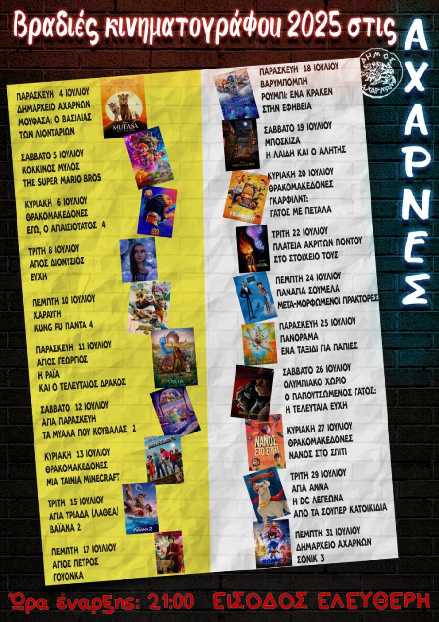 Η Διεύθυνση Πολιτισμού και Αθλητισμού συνεχίζει «on the road» για να φέρει το σινεμά σε κάθε γωνιά του Δήμου Αχαρνών και να προσφέρει αξέχαστες βραδιές σε όλους.
