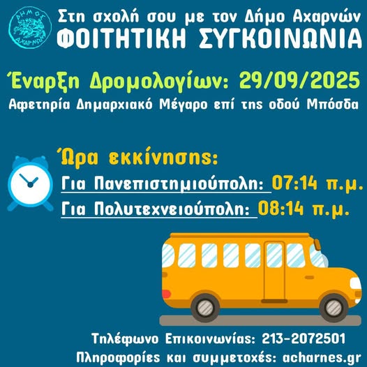 Στο πλαίσιο της δράσης «Κάθε μέρα στη σχολή με το Δήμο Αχαρνών», παρέχεται και φέτος δωρεάν μετακίνηση προς τα Πανεπιστημιακά Ιδρύματα. Από τις 29 Σεπτεμβρίου 2025, οι φοιτητές και οι φοιτήτριες της πόλης μας θα μπορούν να μεταβούν με λεωφορείο του Δήμου Αχαρνών στις σχολές του Εθνικού και Καποδιστριακού Πανεπιστημίου Αθηνών (ΕΚΠΑ) όπως και στις σχολές του Εθνικού Μετσόβιου Πολυτεχνείου (Πολυτεχνειούπολη και Πανεπιστημιούπολη Ζωγράφου). Τη στήριξη του Δήμου Αχαρνών στους φοιτητές της πόλης μας και τις ευχές τους για καλές σπουδές και πολλές επιτυχίες σε κάθε τομέα της ζωής τους εξέφρασε ο Δήμαρχος Αχαρνών Σπύρος Βρεττός.