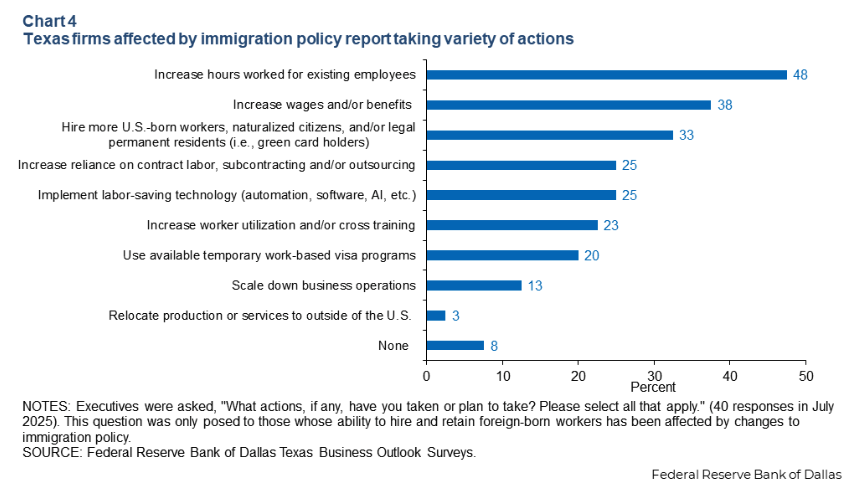 «Οι εταιρείες του Τέξας λαμβάνουν μέτρα για να αντιμετωπίσουν τον αντίκτυπο [του Trump] … [προσφέροντας] συμφωνημένες αυξήσεις μισθών και παροχών και περισσότερες προσλήψεις εργαζομένων γεννημένων στις ΗΠΑ, πολιτών που έχουν λάβει υπηκοότητα ή νόμιμων μόνιμων κατοίκων», αναφέρει έκθεση της τράπεζας που δημοσιεύθηκε την 17η Οκτωβρίου υπογεγραμμένη μάλιστα από οικονομολόγους που υποστηρίζουν τη μετανάστευση.