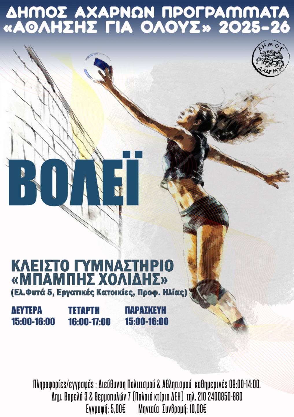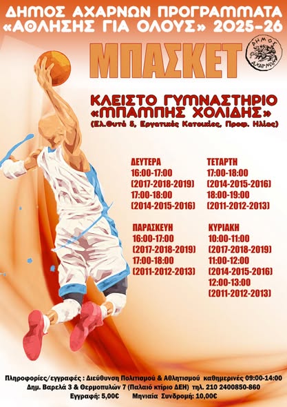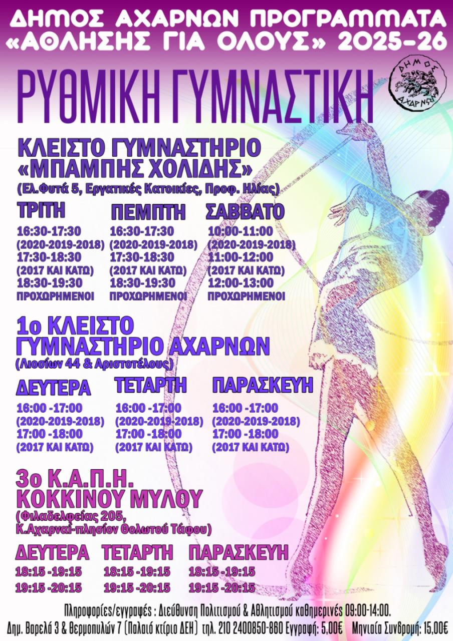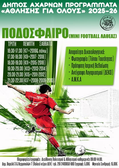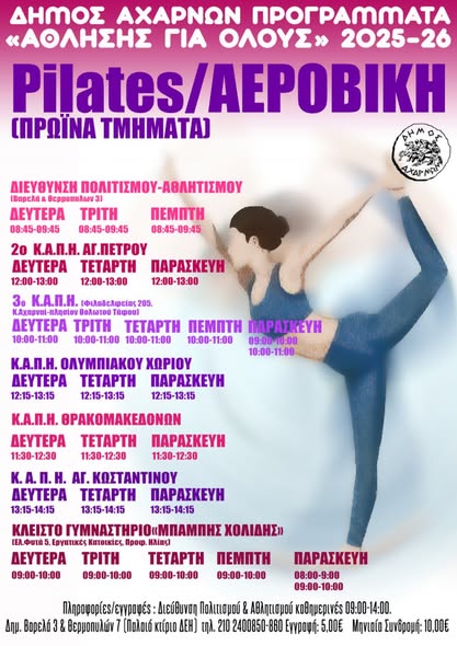 Ο Δήμος Αχαρνών, μέσω της Διεύθυνσης Πολιτισμού, Αθλητισμού και Κοινωφελών Δομών και σε συνεργασία με τη Γενική Γραμματεία Αθλητισμού, ανακοινώνει την έναρξη των Προγραμμάτων Μαζικού Αθλητισμού για τη νέα περίοδο.