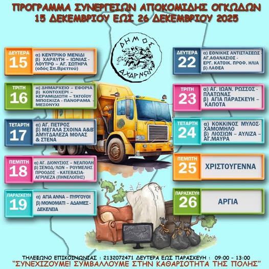 Η Διεύθυνση Καθαριότητας και Ανακύκλωσης του Δήμου Αχαρνών ανακοινώνει το πρόγραμμα αποκομιδής ογκωδών αντικειμένων από τις 15 έως και τις 24 Δεκεμβρίου.
