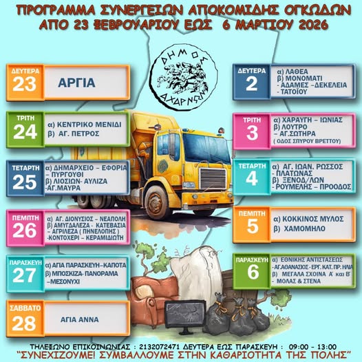 Η Διεύθυνση Καθαριότητας και Ανακύκλωσης ενημερώνει τους δημότες για το πρόγραμμα συλλογής ογκωδών αντικειμένων που ισχύει από χθες για το διάστημα 24 Φεβρουαρίου έως τις 6 Μαρτίου με στόχο τη βελτίωση της καθημερινότητας και της εικόνας της πόλης.