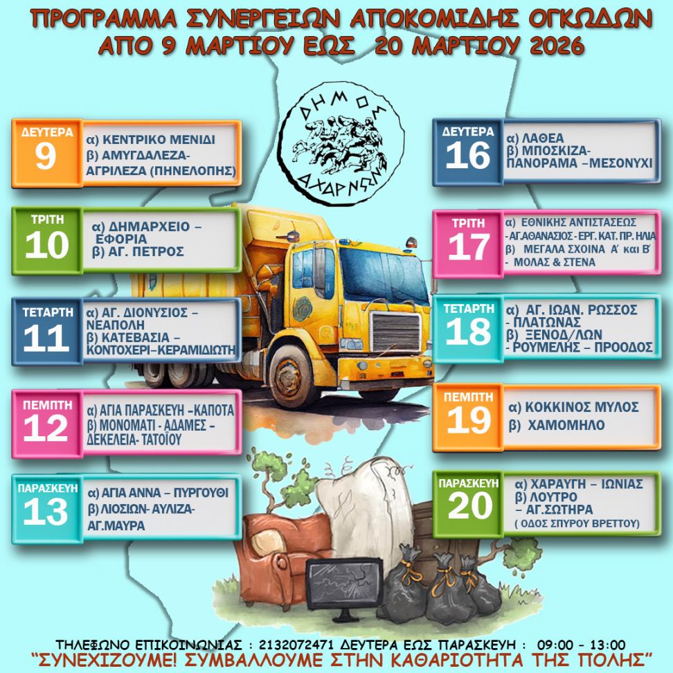 Η Διεύθυνση Καθαριότητας και Ανακύκλωσης ενημερώνει τους δημότες για το πρόγραμμα συλλογής ογκωδών αντικειμένων για το διάστημα από 9 Μαρτίου έως τις 20 Μαρτίου με στόχο τη βελτίωση της καθημερινότητας και της εικόνας της πόλης.