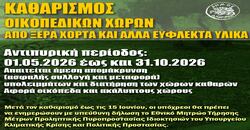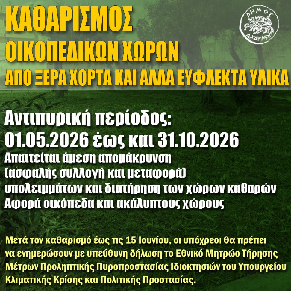 Ενόψει της αντιπυρικής περιόδου 2026 (01.05.2026 έως και 31.10.2026) παρακαλούμε όπως προβείτε σε καθαρισμό των οικοπέδων – ακάλυπτων χώρων σας από την 1η Απριλίου έως και την 15η Ιουνίου 2026, την άμεση απομάκρυνση (ασφαλή συλλογή και μεταφορά) των υπολειμμάτων και διατήρηση των χώρων σε αυτή την κατάσταση έως 31 Οκτωβρίου.